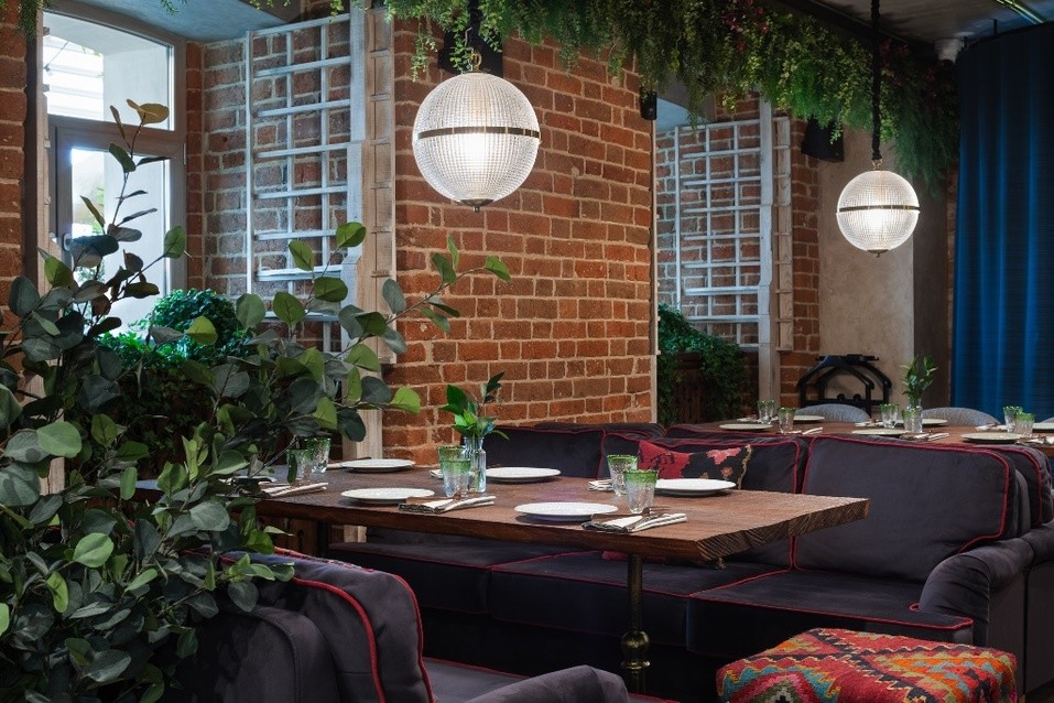 Помимо этого чувствуется и атмосфера самой Грузии: старые ковры, плетёные стулья, кресло-качалка, обилие зелени, мягкие диваны цвета виноградного сорта саперави, яркие узорчатые подушки, картина с изображением глиняной вазы бирюзового оттенка, которая была написана грузинским художником Константином Татибадзе.